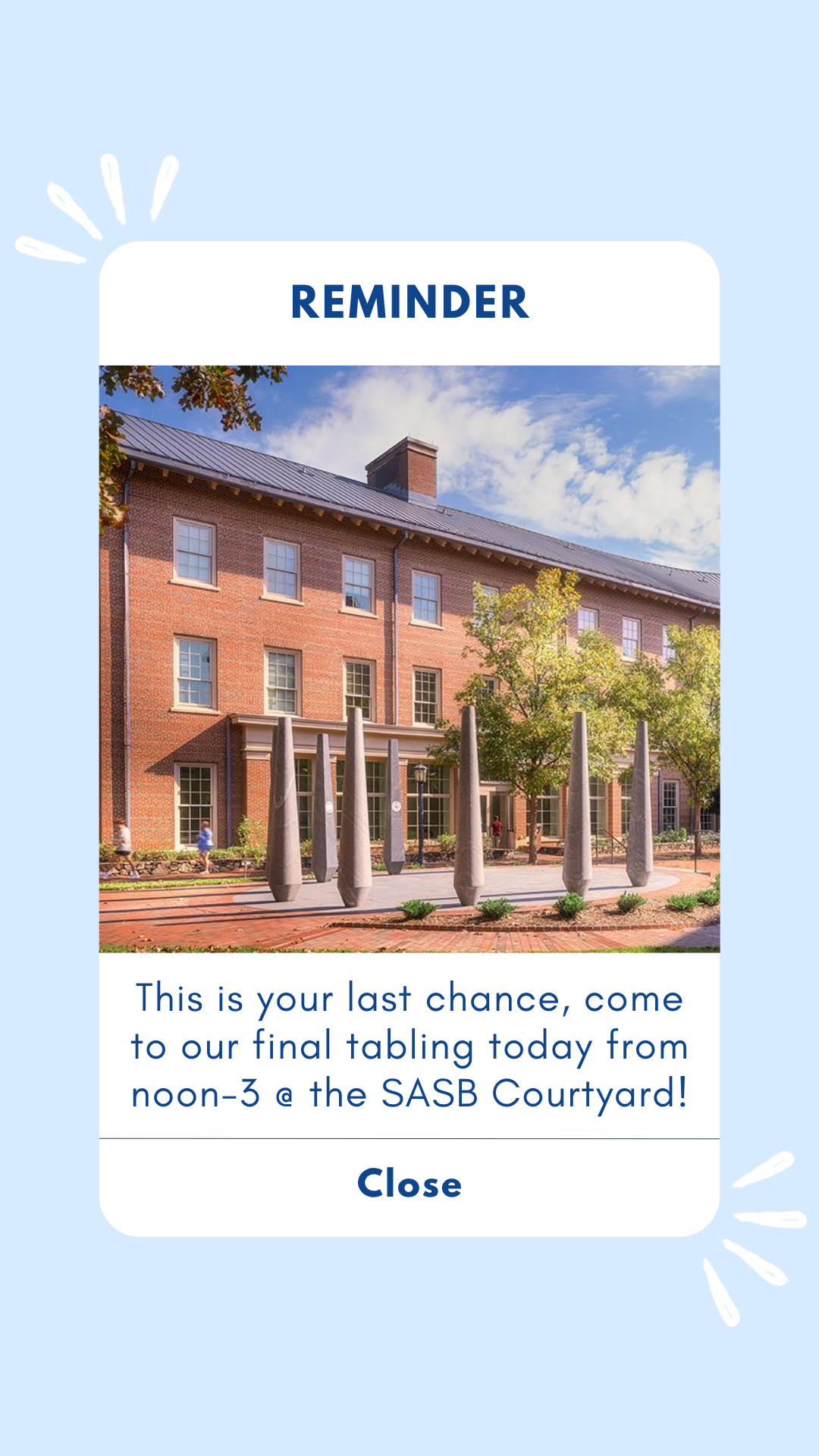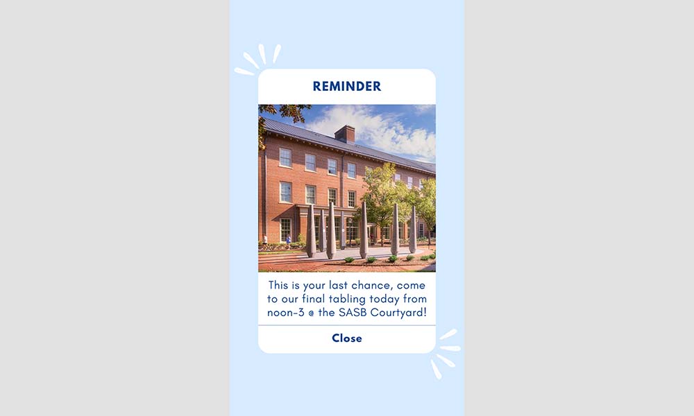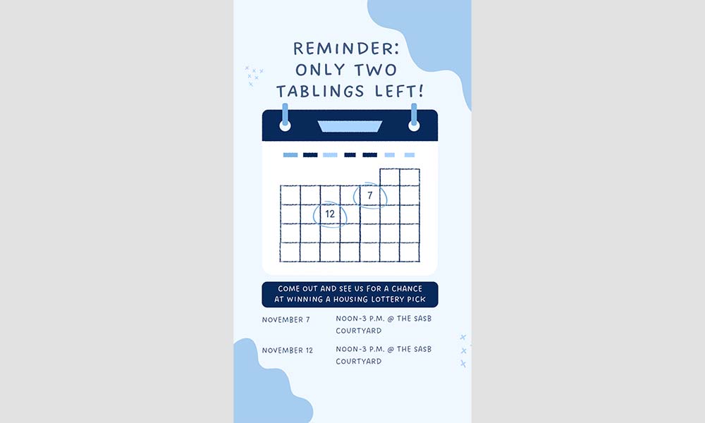 REMINDER: This is your last chance, come to our final tabling from noon-3 p.m. @ the SASB Courtyard! Published on the Carolina Housing Instagram account during the Fall 2024 semester.