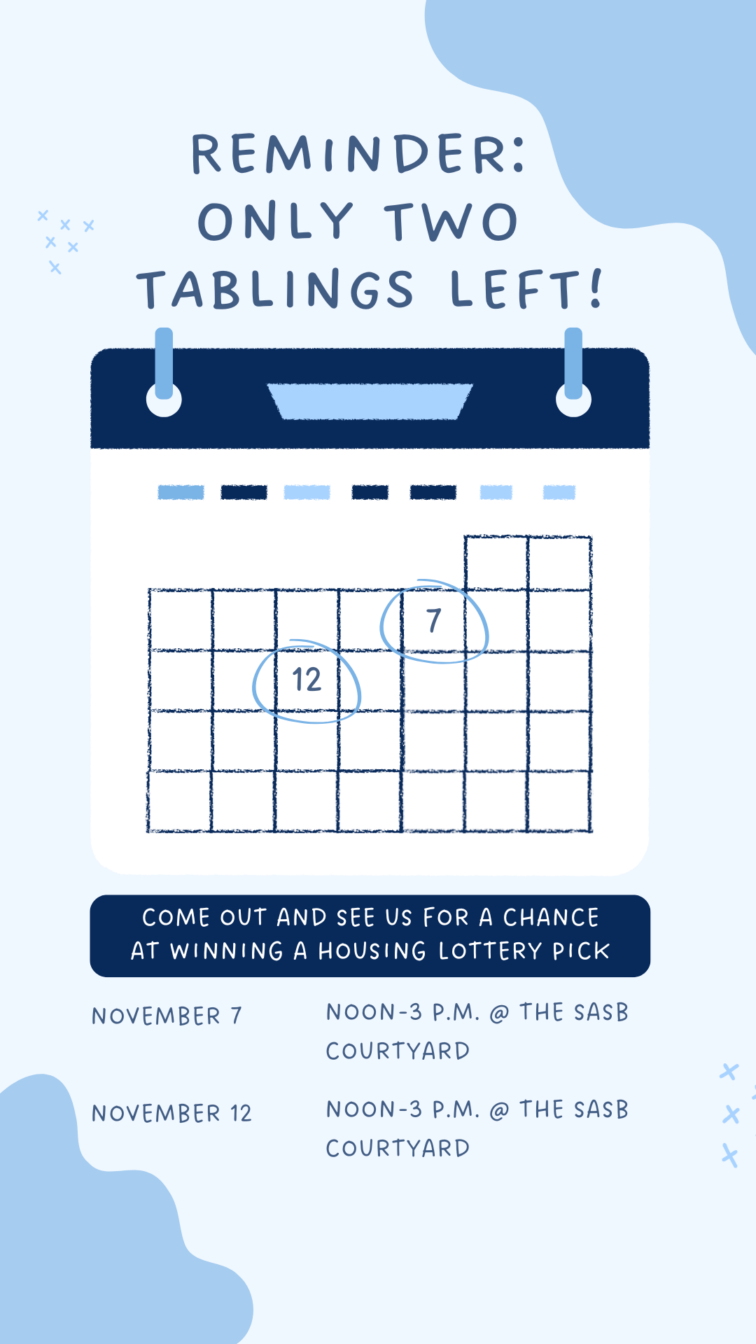 Reminder: Only two tablings left! Come out and see us for a chance at winning a housing lottery pick. Published on the Carolina Housing Instagram account during the Fall 2024 semester.